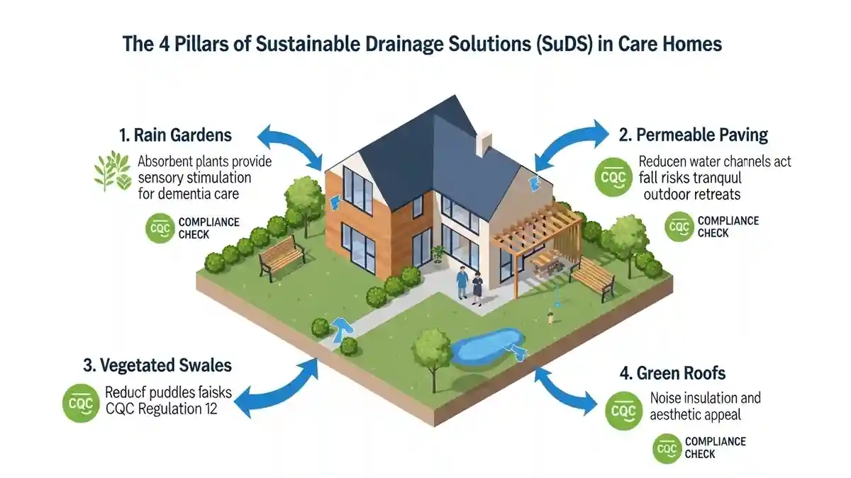 The future of sustainable drainage solutions CQC care home design is the integration of SuDS (Sustainable Drainage Systems). In Wandsworth, Policy EN18 of the Local Plan encourages SuDS to manage surface water runoff, which often plagues the surrounding area.